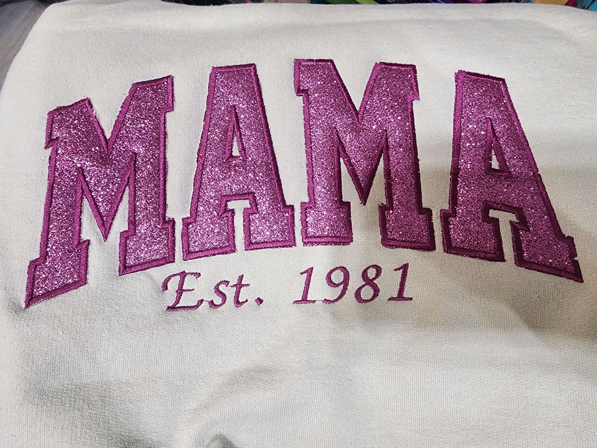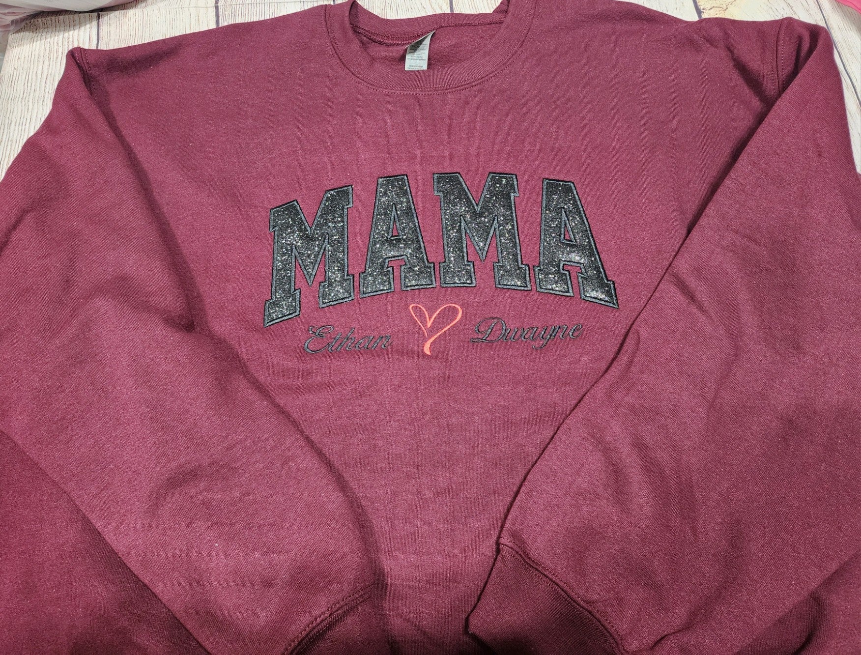 Elevate your mom style game with our MAMA sweatshirt. Customize with up to 3 names on the sleeve or front in your choice of color thread and material. Available in multiple colors. This sweatshirt offers endless possibilities for a unique, personalized look. Perfect for any mom looking to make a statement!